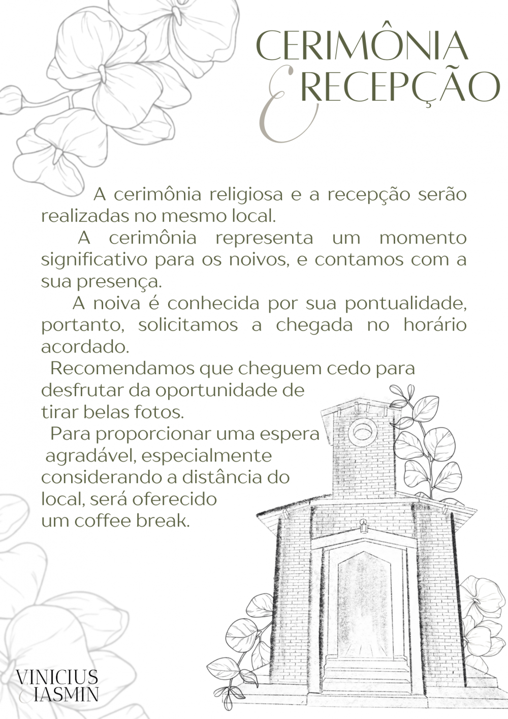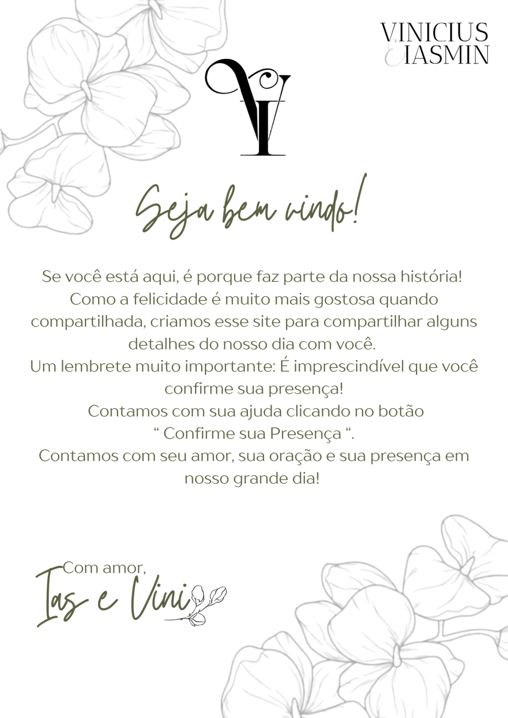 A sua presença no nosso casamento já representa o melhor presente que poderíamos desejar! Contudo, para aqueles que desejarem presentear-nos, considerando que já temos um lar repleto de amor e afeto, gostaríamos que o gesto se traduzisse em contribuições monetárias, seja no dia da celebração ou através dos vales comprados pelo site. Se puder nos enviar uma linda mensagem junto do presente ficaremos gratos com tanto carinho. Desde já, agradecemos imensamente!